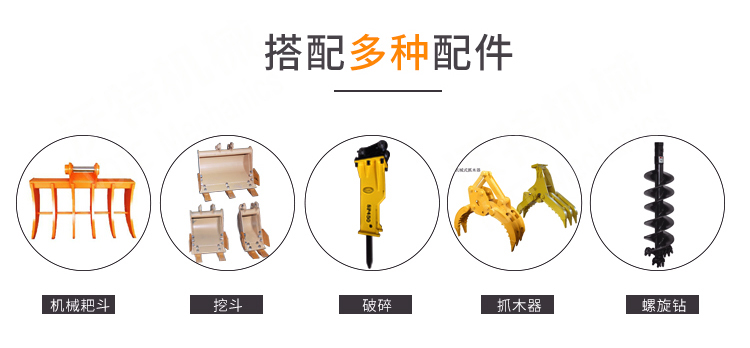 4、作业范围广,使用快速更换接头,可选配旋挖钻、破碎锤、装载斗、抓具等各种属具。