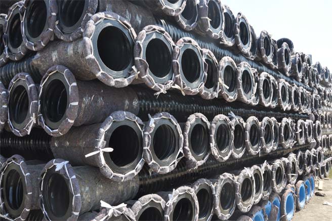 管道采用螺旋焊接波纹钢管为主体,相当于壁厚6倍的钢管强度