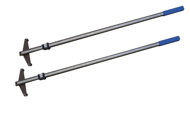支距尺主要有刻线长度1300mm和1400mm两种规格铁路支距尺,它包括有尺身和标度尺,其特征在于该支距尺尺身为双工形型材结构,型材为上下两边带有水平外沿延伸的方形管,在上边外沿延伸两边的内侧顺向开有槽口带有标度尺的不锈钢板顺着槽口放入,镶在支距尺的上 面,在其外端以带有凸出的销钉固定,尺身里端垂直固定有十字板,十字板下面固定有测头,尺身中间装有滑动游框,尺身、标度尺和游框装在一起成一整体测距装置