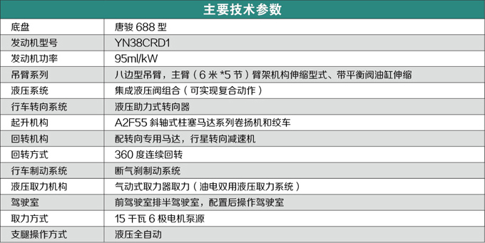 自制吊车专用底盘,潍柴4102大功率发动机动力强劲,行车带液压助力式方向机、断气刹制动系统、带有中心回转器可实现360度无限度连续旋转,50锰锻打燧火轨道加工回转支承,转向采用可靠耐用的吊车专用行星减速机,乐虎88国际五边型吊臂专利技术,全液压伸缩式支腿,大跨度幅式H字型支腿大架,起升双速度设计,主卷扬采用8吨液压绞车(轴向柱塞马达)、副钩采用乐虎88国际专利高低速常闭式卷扬机(支持快速放绳),液压系统采用伺服控制(可实现多项复合操作),流线型驾驶室,国际行业低价位。可安装电机泵站,直接以380V电源作动力,节约环保。产品轻便灵活,价位低廉,适用于农村及城乡结合部工作。低价位投资,高档产品回报。为了降低客户的风险,公司还随车给每台产品在中国人寿财产股份有限公司入了一年的与产品同价值质量责任保险,客户可更放心使用。