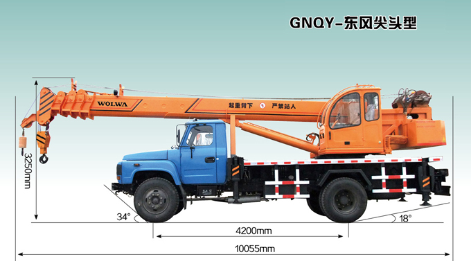 GNQY-东风尖头型吊车是是一款性能好操作灵活的12吨小型汽车起重机,以东风尖头汽车吊装底盘做行走,驾驶更舒适、安全。可安装电机泵站,直接以380V电源作动力,节约环保。该产品通过全国机动车公告公示,在全国各地均可上牌照,并且购置费及其他营运费用全免,产品轻便灵活,价位低廉,适用于农村及城乡结合部工作。低价位投资,高档产品回报。